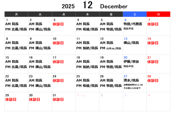 土曜日の診察受付時刻が2025年9月より以下のように変更になっております。