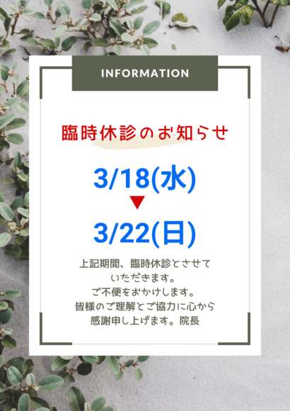 3月19日(木)と3月21(土)は院長の研修のため、臨時休診とさせて頂きます。
